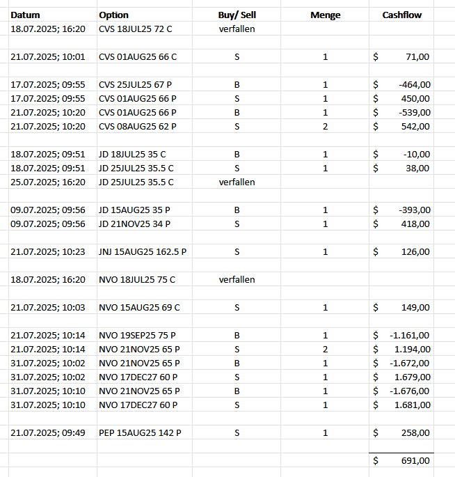 Diese Trades habe ich im Juli 2025 getätigt. Mit einem Cashflow von 691 $ kam eine ganz gute Summe zusammen. Bitte beachte, dass es sich dabei um Brutto-Angaben handelt, also vor Steuerabzug.