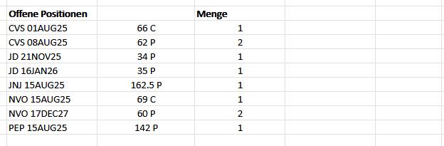 Es gab noch weitere Vorkommnisse, die muss ich aber auf meine eigene Kappe nehmen: Beim Rollen des CVS-Puts von Strike 67 auf Strike 66 ist mir ein Fehler unterlaufen, sodass ich mit Verlust gerollt habe. Genau das will ich eigentlich tunlichst vermeiden, ich war aber unaufmerksam und es ist leider doch passiert. Auch bei dem Rollvorgang des NVO-Puts von Strike 65 auf Strike 60 war ich wohl etwas verpeilt und habe nur einen Put gerollt, obwohl ich zwei hatte. War aber nicht weiter schlimm, weil ich es gleich gemerkt habe und einfach zwei Vorgänge daraus gemacht habe (beide konnte ich trotzdem mit Gewinn rollen).