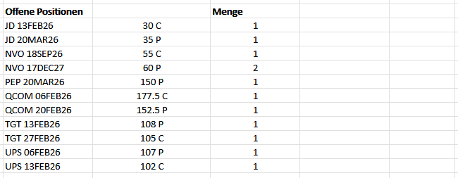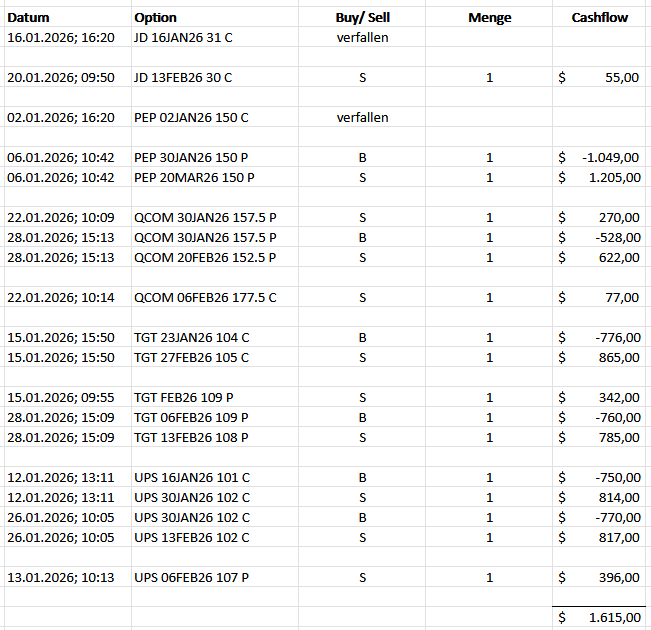 Diese Trades habe ich im Januar 2026 getätigt. Das neue Jahr hat mit einem Cashflow von 1.615 $ super gestartet, so kann es gerne weitergehen. Bitte beachte, dass es sich dabei um Brutto-Angaben handelt, also vor Steuerabzug.